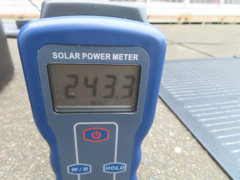 くもり(直達日射なし) 傾けて設置(受光量小) 水平設置(受光量多) 日射量243.3W/m2 ポータブル電源へ33W