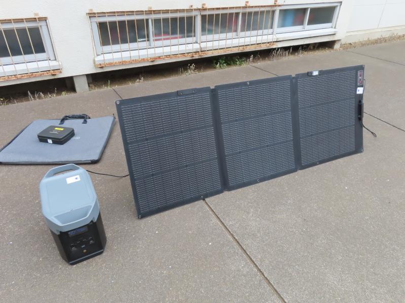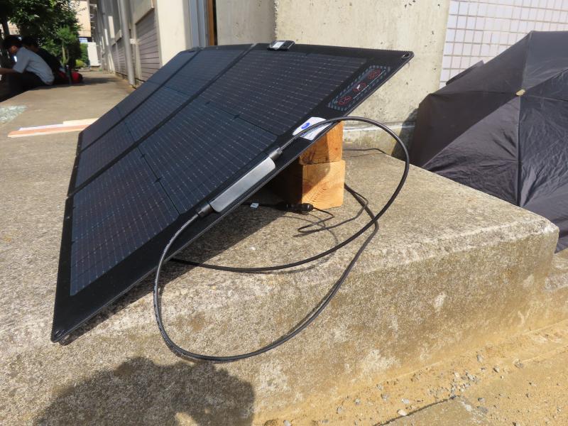屋根角度と同じ30度で南向きに固定しポータブル電源と繋ぐ 9時から10分ごとに全天空日射量と発電量を測定