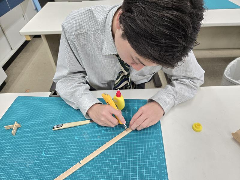 スチレンボードに描かれた線に沿ってカッターで切り取り、 木工作の基礎となる「のこぎり」や「のみ」の使い方を学びます。