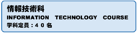 コンピュータは現代社会のあらゆる分野で利用されており、私たちは多大な恩恵を受けています。情報技術科では、コンピュータ、電子技術、情報通信に関連した技術を幅広く学習します。また、電子回路設計の技能検定や、工事担任者試験などの国家資格取得、情報技術を活かしたものづくりにも力をいれて取り組んでいます。