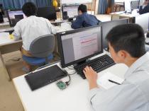 この大会は、県内の情報系学科に在籍する1・2年生の生徒たちが、7セグメントLEDやブザー、DCモータ、ステッピングモータなどの出力機器とスイッチやセンサなどの入力機器をマイコン制御するためのプログラミングスキルを競います。本校からは情報技術科の2年生3名、1年生1名の計4名が出場し、